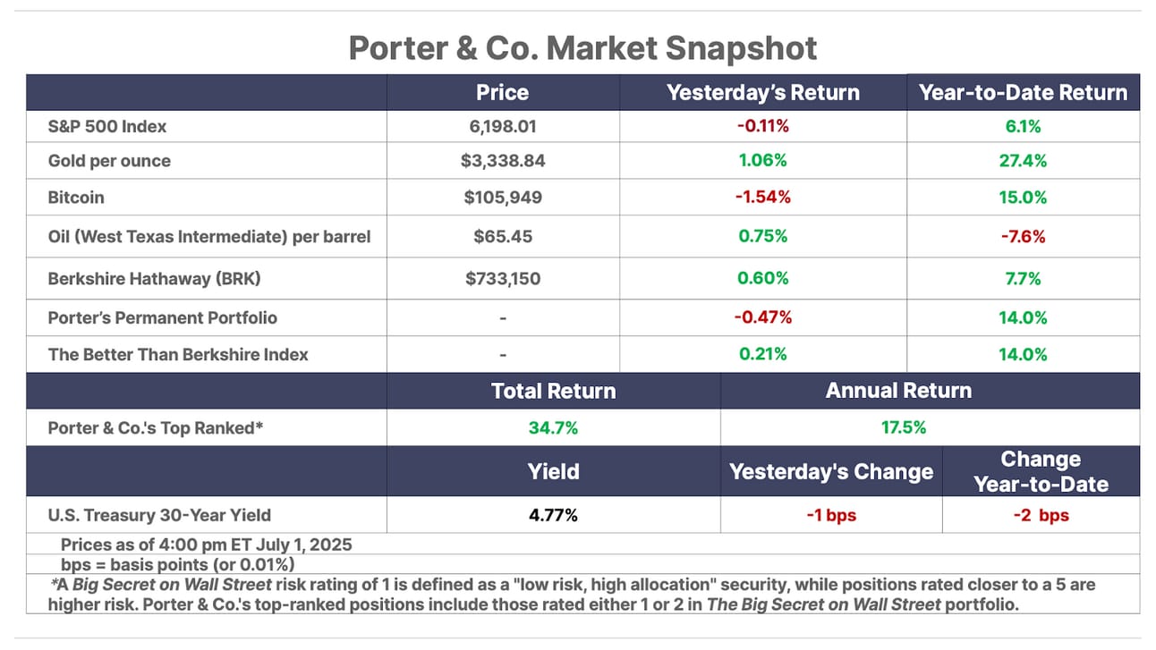 This is Porter’s Daily Journal, a free e-letter from Porter & Co. that provides unfiltered insights on markets, the economy, and life to help readers become better investors. It includes weekday editions and two weekend editions… and is free to all subscribers.