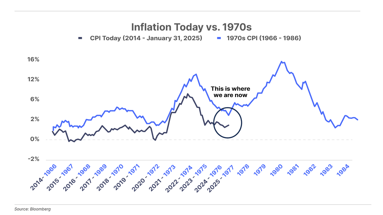 2. Inflation is moving the wrong way. This morning, the Bureau of Labor Statistics reported that the consumer price index (CPI) rose 0.5% in January, representing an annual inflation rate of 3.0%. Wall Street economists had expected a rise of 0.3%, or 2.9% annualized. Given Powell’s comments above – and the eerily similar path of inflation today versus the 1970s – it’s looking increasingly likely that the Fed’s rate-cutting cycle may already be finished.