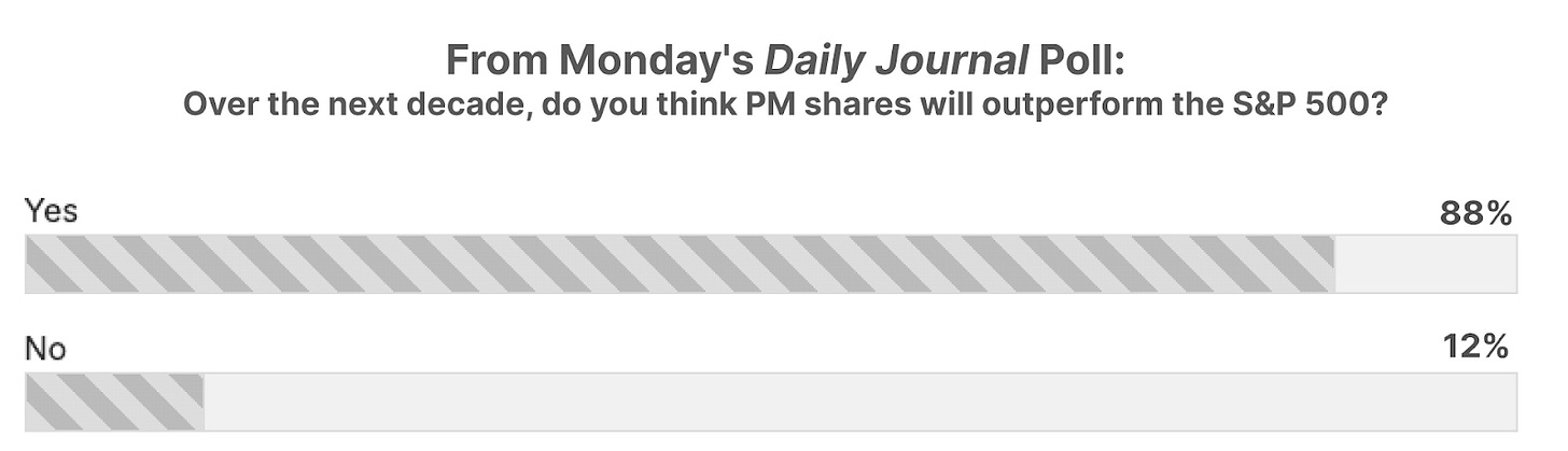 In Monday’s Daily Journal, Porter replied to a reader's question about the seemingly high level of debt that Philip Morris (PM) carries, by explaining the difference between good debt that helps drive brand value (like Philip Morris has) – and bad debt that drags down performance. Pointing to PM shares’ 79% return since 2021, we asked readers if they thought Philip Morris would continue to outperform the S&P 500 over the next decade. And… 88% of survey takers feel that PM shares will indeed outperform the S&P over the next 10 years.