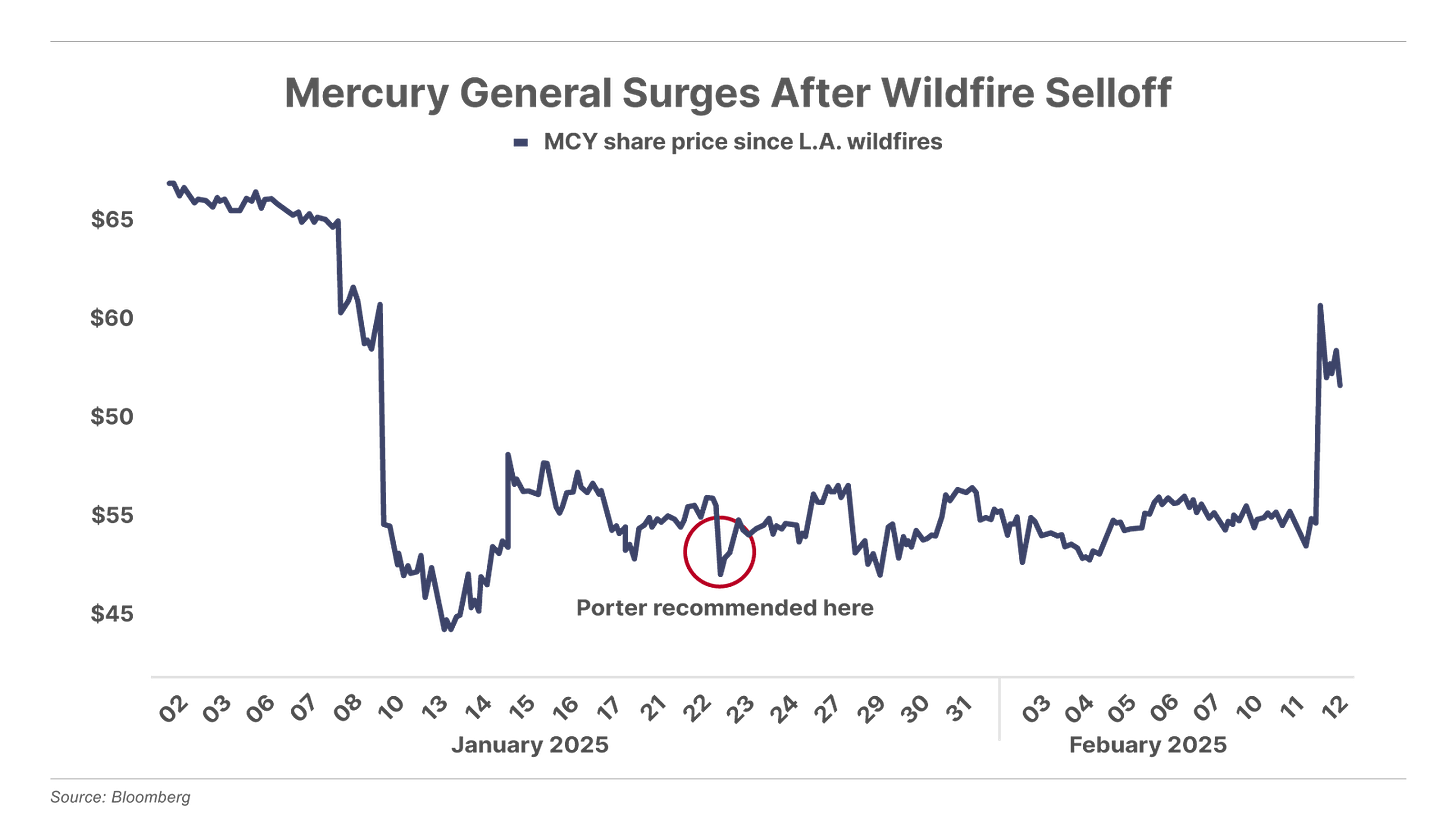 On January 22, Porter wrote about property & casualty insurance stocks – pointing out how these companies are going to be less affected by the California wildfires than most investors might think. Porter also suggested that the shares of insurer Mercury General (MCY) -- which had fallen 25% in the week after the L.A. wildfires started, due to concerns over the company's exposure – "might be a great opportunity over the next year" due to the market's overreaction.