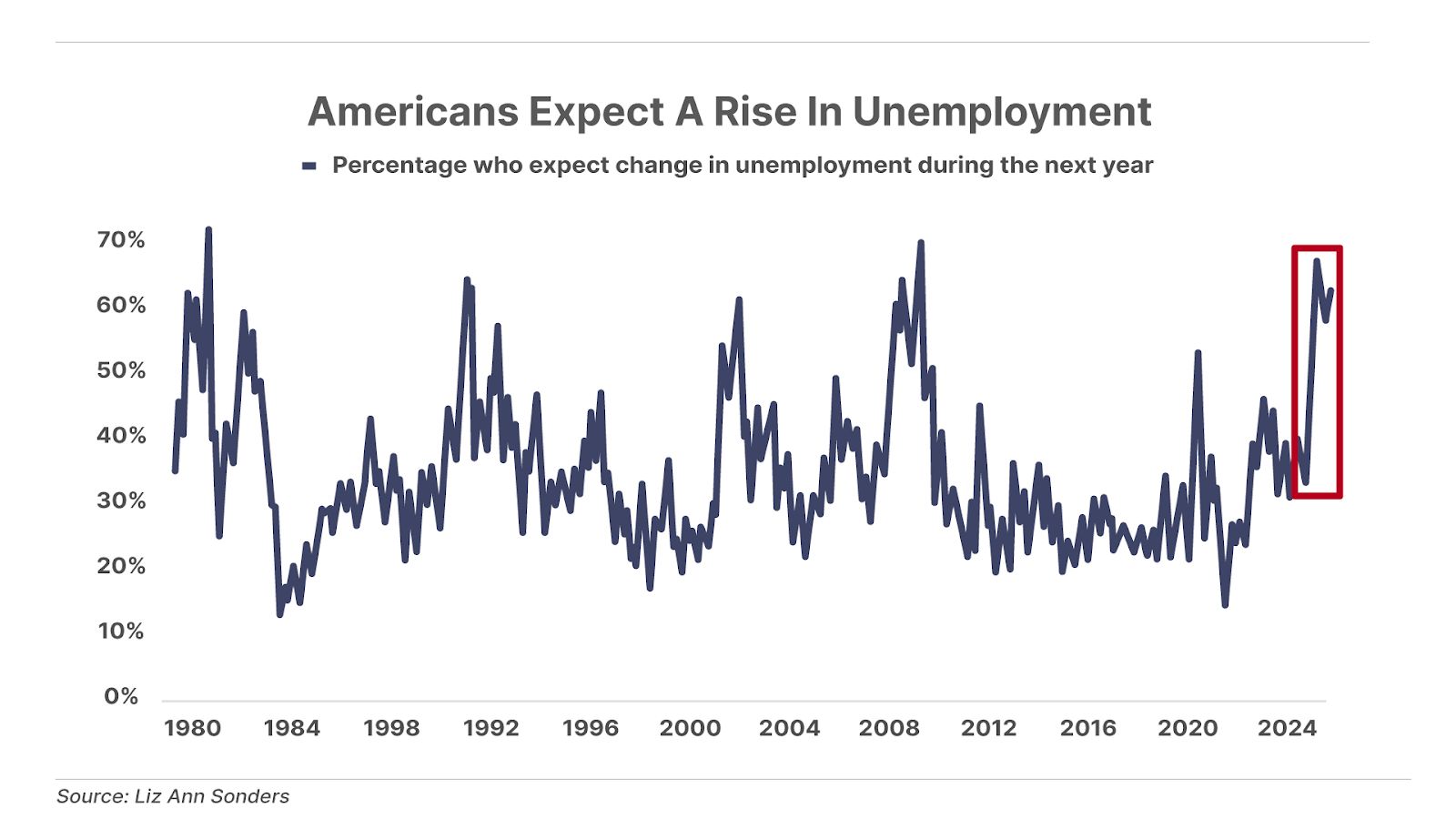 1. Labor market flashes warning signs. The percentage of Americans expecting higher unemployment over the next year has surged to 62% – up from just over 30% this time last year, and the highest reading since the depths of the 2008 financial crisis. Historically, readings this high have only been seen during recessions.