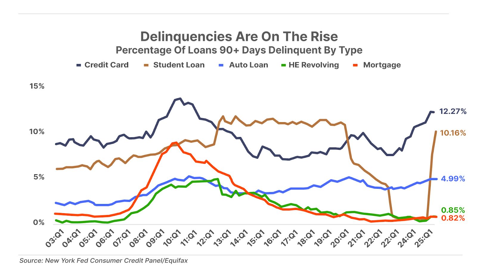 2. Delinquencies are rising. Credit card delinquencies just surged to 12.3% – the highest level since the Global Financial Crisis. With student loan repayment collections resuming, those delinquencies have also jumped to 10% and are poised to climb further as borrowers struggle with outdated terms or refuse to pay after nearly three years of forbearance. Auto loans are showing similar strain, with delinquencies near 5%, a 14-year high. Rising delinquencies signal that consumers are under mounting financial pressure.