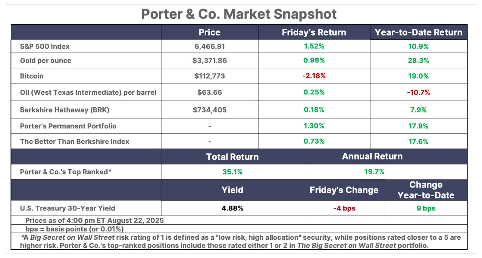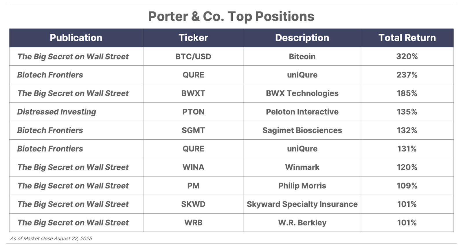 Please note: The investments in our “Porter & Co. Top Positions” should not be considered current recommendations. These positions are the best performers across our publications – and the securities listed may (or may not) be above the current buy-up-to price. To learn more, visit the current portfolio page of the relevant service, here. To gain access or to learn more about our current portfolios, call Lance James, our Director of Customer Care, at 888-610-8895 or internationally at +1 443-815-4447.