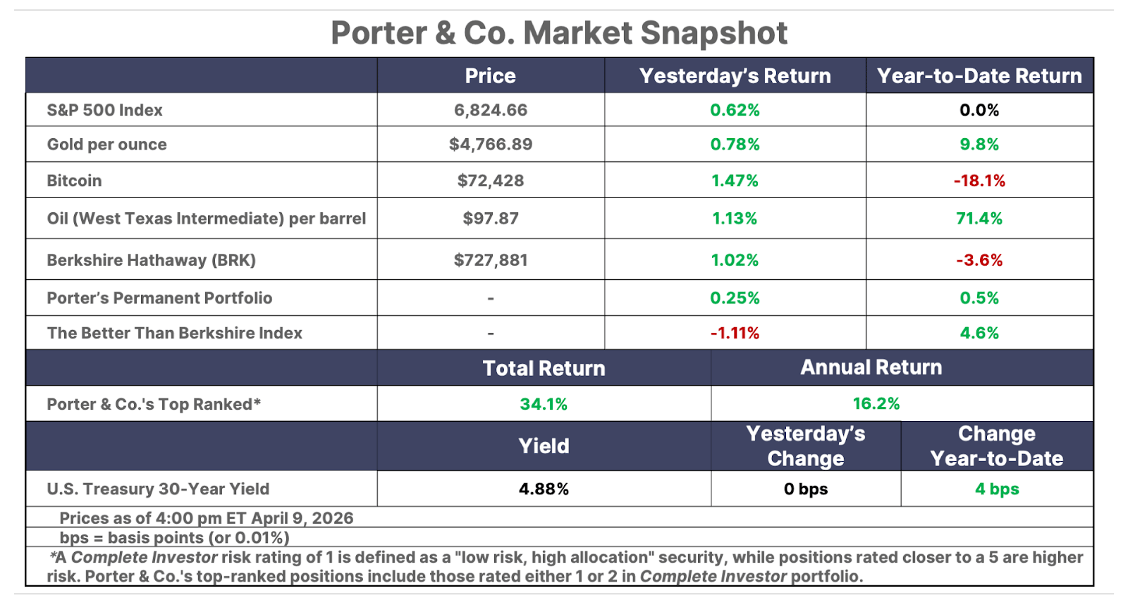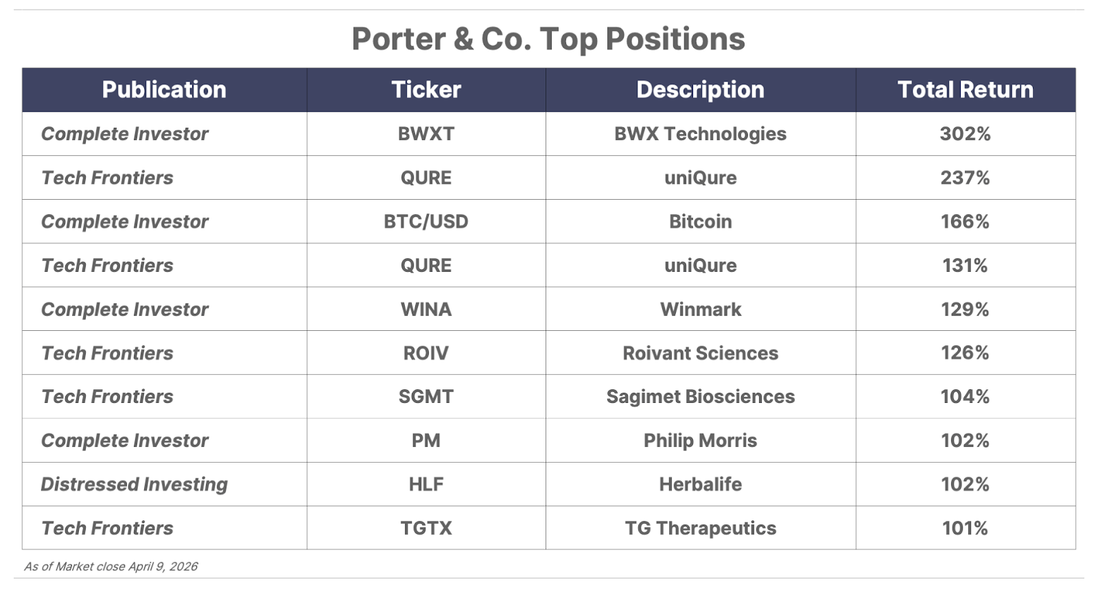 Please note: The investments in our “Porter & Co. Top Positions” should not be considered current recommendations. These positions are the best performers across our publications – and the securities listed may (or may not) be above the current buy-up-to price. To learn more, visit the current recommendations page of the relevant service, here. To gain access or to learn more about our current recommendations, call our Customer Care team at 888-610-8895 or internationally at +1 443-815-4447.