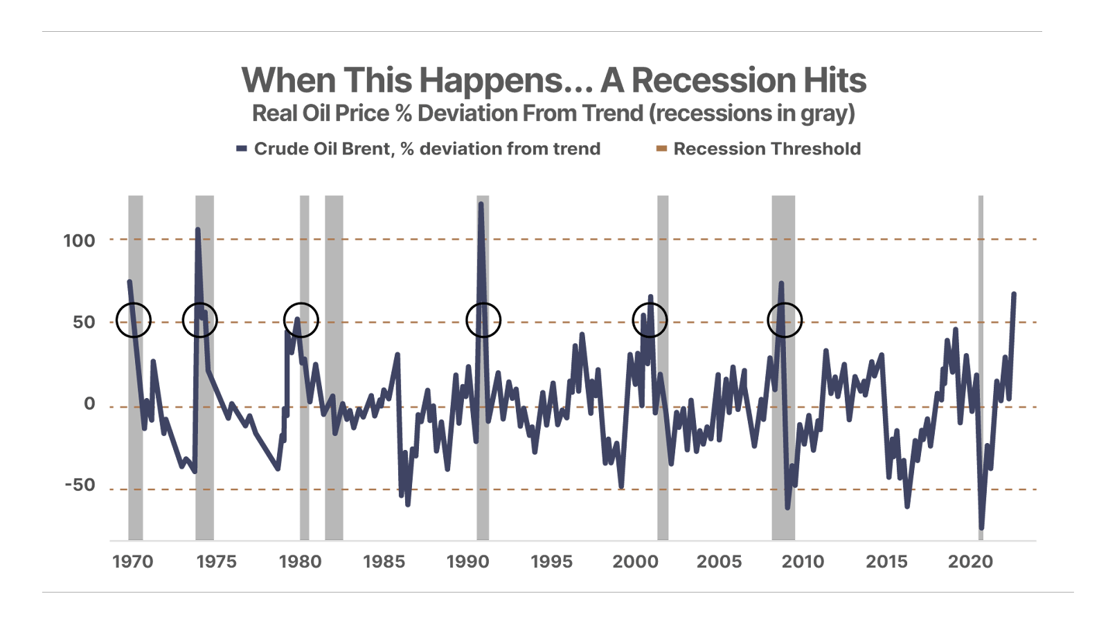 1. An every-time oil-recession indicator just triggered. Every time crude-oil prices surge more than 50% above their long-run trend, a U.S. recession follows. The track record is six for six going back to 1970 – and Brent crude just crossed that threshold. But here’s the part the spot prices don’t yet reflect: the physical oil market is far more stressed than the headline price implies. Strait of Hormuz disruptions have knocked an estimated 11.4 million barrels per day off global commercial supply. Which means… the recession signal may actually be understating the energy shock transmission risk into the real economy.