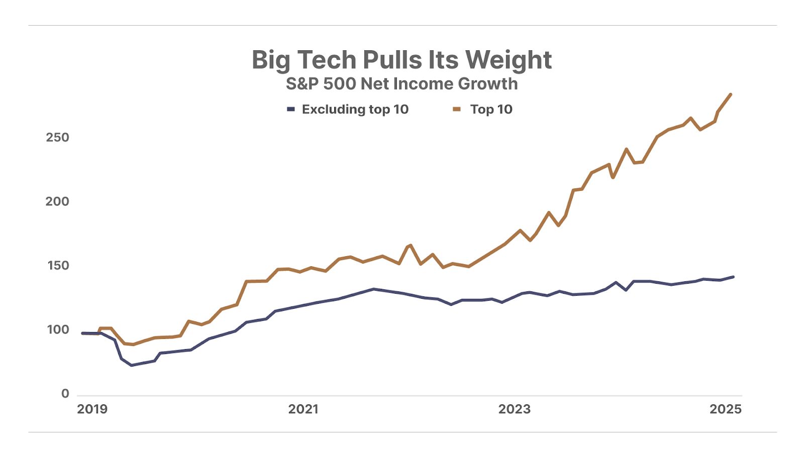 1. Big tech outperforms the rest of the market. Virtually all of the earnings growth in the S&P 500 since 2022 has come from the index’s top 10 largest companies. Meanwhile, the bottom 490 companies have collectively generated flat earnings over the same period. The market is increasingly dominated by a handful of tech companies benefitting from the artificial intelligence (“AI”) boom. But there’s just one problem…