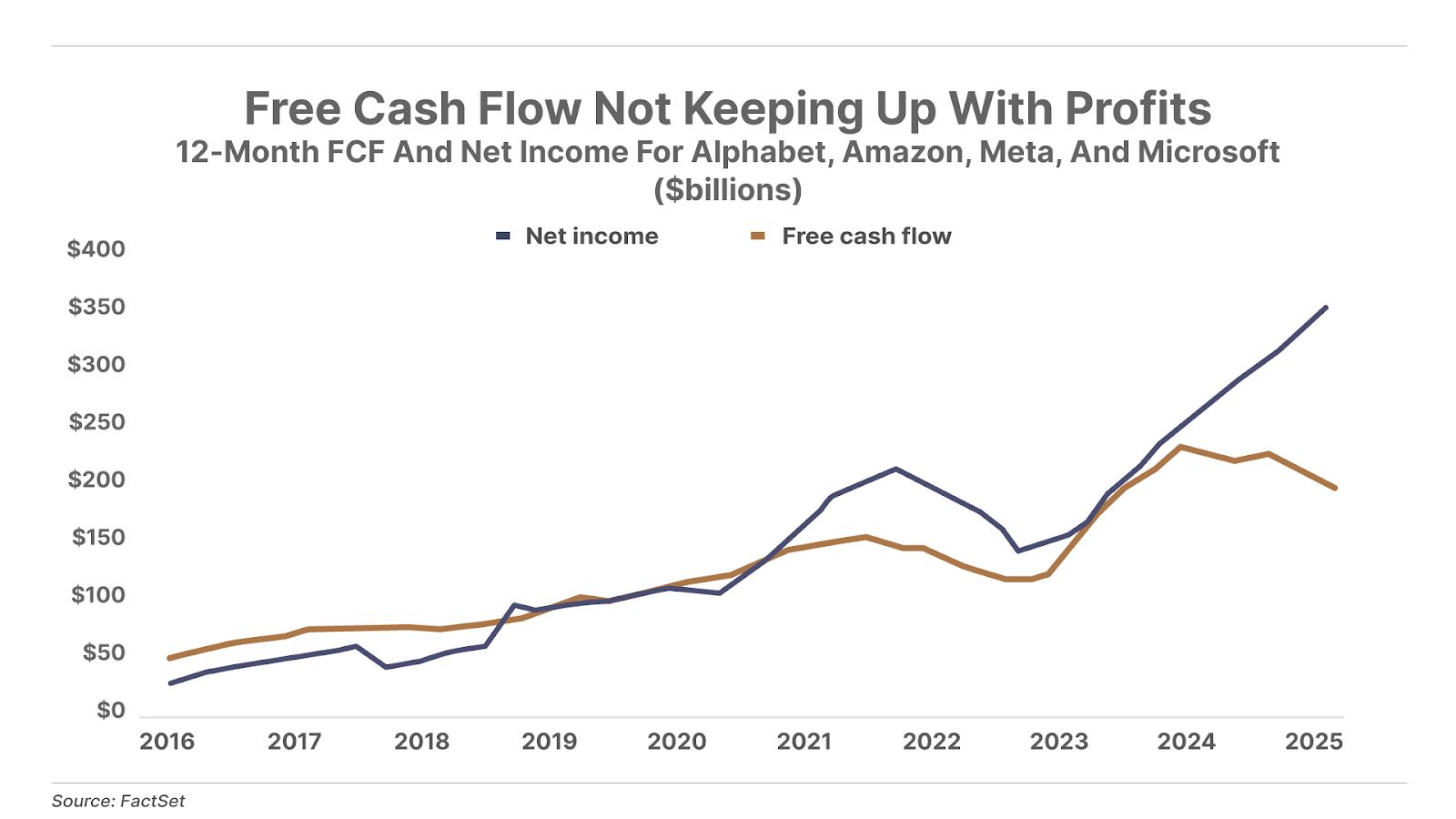 2. Big tech cash flows are falling short. Up until the AI boom kicked off with the launch of ChatGPT in late 2022, big tech’s free cash flow generally tracked their earnings growth. But since 2023, these companies have been sinking earnings into capex for data centers and other AI infrastructure. As a result, free cash flows are falling even as reported earnings are rising. This sets up a key risk for tech stocks and the overall market if the AI capex boom doesn’t eventually lead to free cash flow growth.