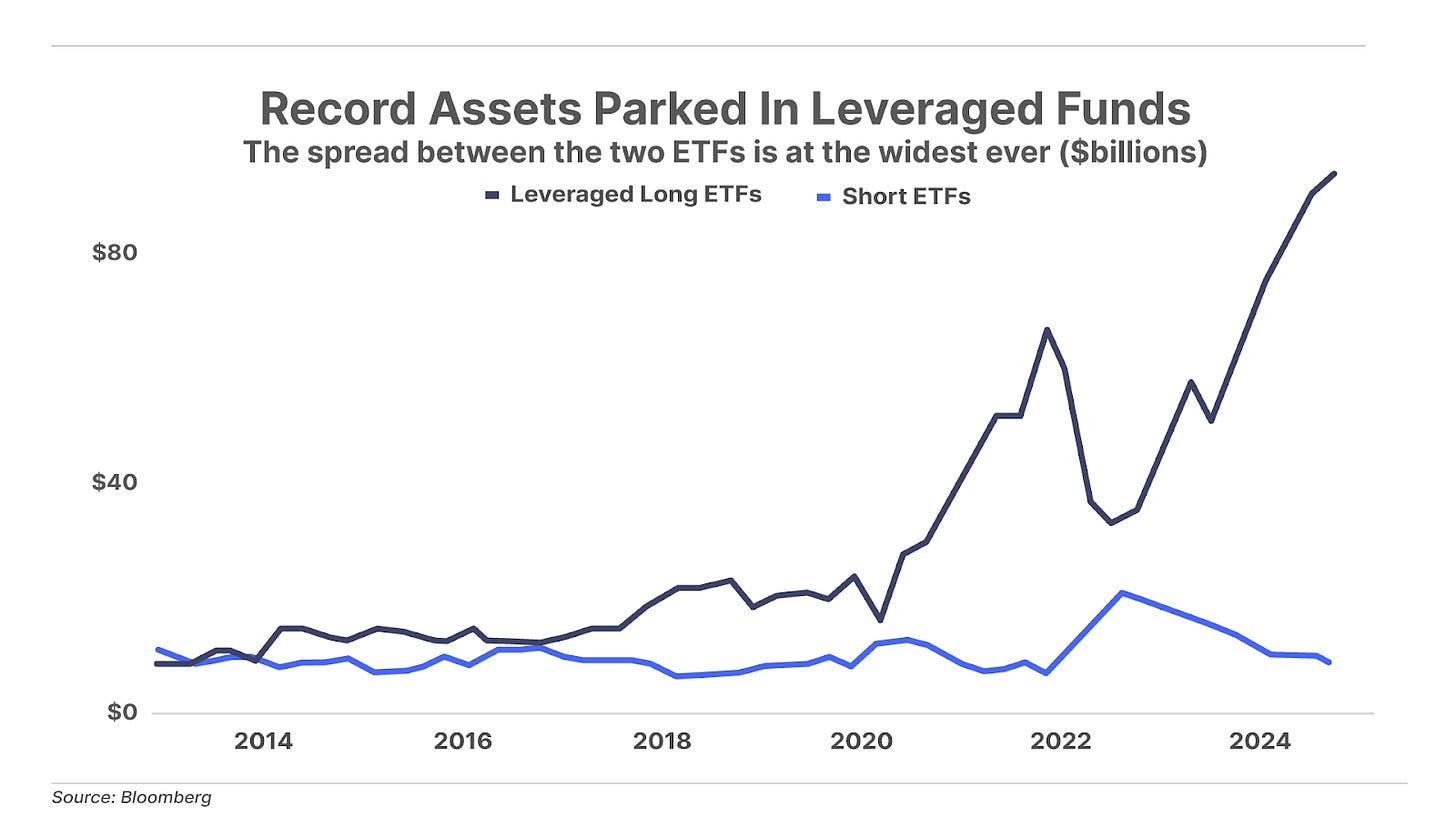 3. Retail investors ride a wave of euphoria as they embrace risk. Leveraged long ETFs – funds that amplify index gains by two or three times – reached a record $95 billion in assets last week. This marks a 40% increase from the previous peak during the 2021 market frenzy. In contrast, short ETFs (which track the opposite – betting on an index’s decline) hold just $8.5 billion in assets. This lopsided ratio of $11 in leveraged long ETFs for every $1 in short ETFs signals heightened risk if the market turns. Meanwhile, the percentage of U.S households financial assets allocated to equities has surged to an all time-high of 43% – four percentage points above the peak of the dot-com bubble.