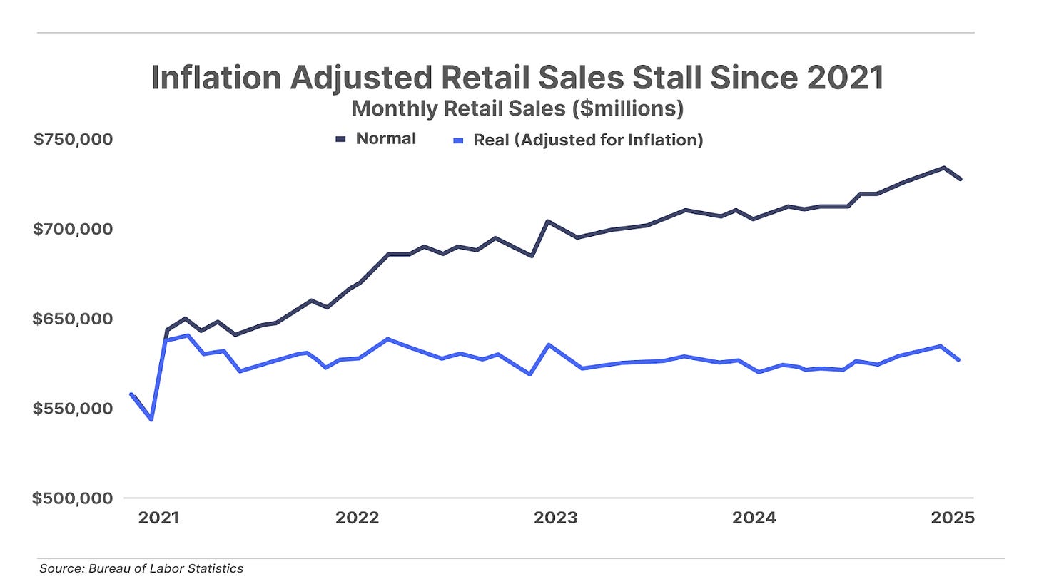 2. Inflation might be hot but retail is not. Retail sales contracted by 0.9% last month, far worse than the anticipated 0.2% decline, marking the steepest drop since March 2023. Although retail sales have surged 27% since 2021, when adjusted for inflation retail sales have risen only 4%. One thing is clear: higher prices (inflation) are straining consumers' purchasing power and weighing on real consumption.
