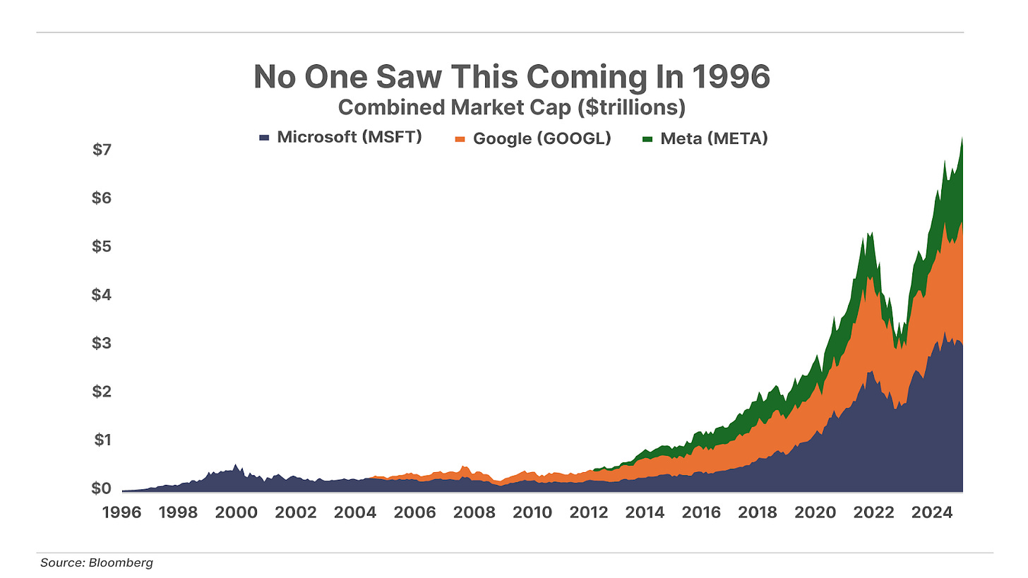 Google was founded two years later. Friendster, the first social network, was founded six years later. In less than 10 years, social networks (Facebook) and search (Google) were worth more than $100 billion. And today, almost 30 years later, Meta (Facebook and Instagram) and Google combined are worth more than Microsoft. But Gates never invested in either!