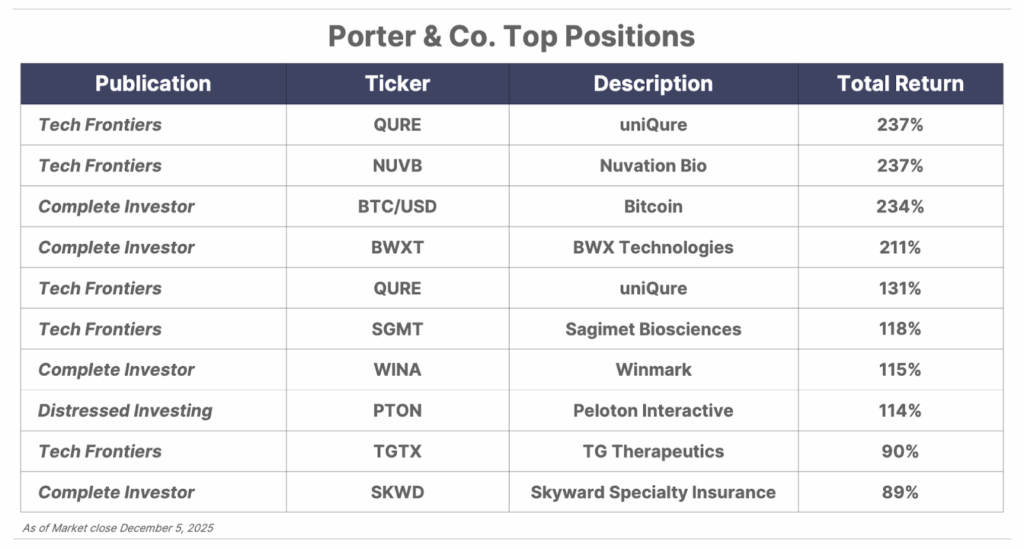 Please note: The investments in our “Porter & Co. Top Positions” should not be considered current recommendations. These positions are the best performers across our publications – and the securities listed may (or may not) be above the current buy-up-to price. To learn more, visit the current portfolio page of the relevant service, here. To gain access or to learn more about our current portfolios, call our Customer Care team at 888-610-8895 or internationally at +1 443-815-4447.