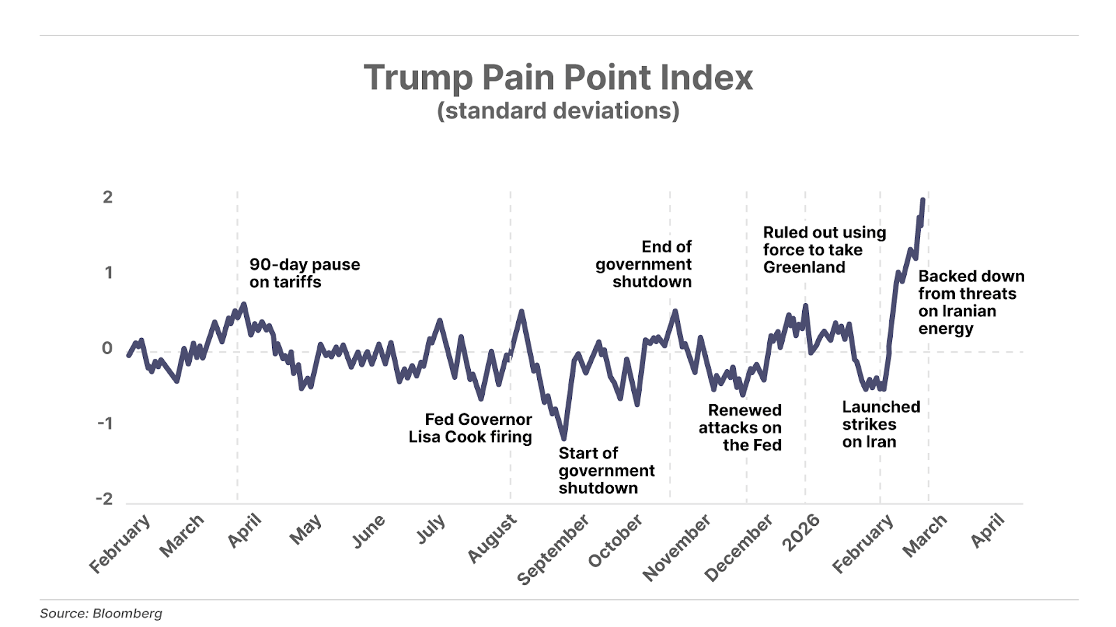 1. The Trump Pain Point Index is soaring. The index – which combines inverse S&P 500 returns, 10-year U.S. Treasury yields, 30-year mortgage rates, gasoline futures, 1-year CPI swaps, and presidential approval ratings into a single measure of economic and political pain – just hit two standard deviations above its mean for the first time ever. Every major spike in this index over the past 15 months has been followed by a White House course correction. The pattern is clear… When bond yields rise and stocks fall, President Trump blinks. The index is screaming that the threshold has been crossed again. The only question is whether ending the war with Iran is still within the president’s control.