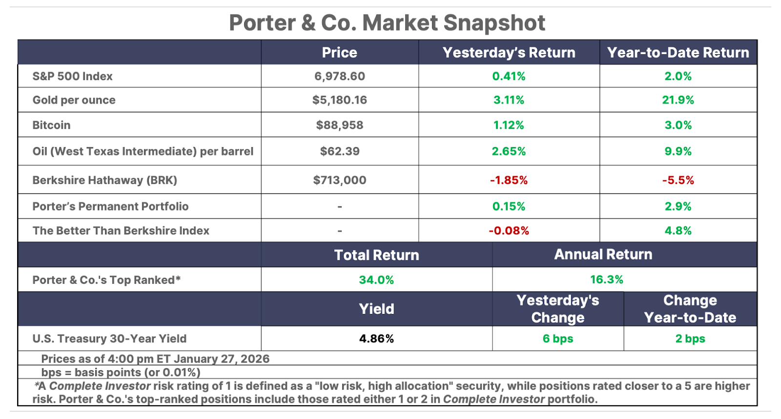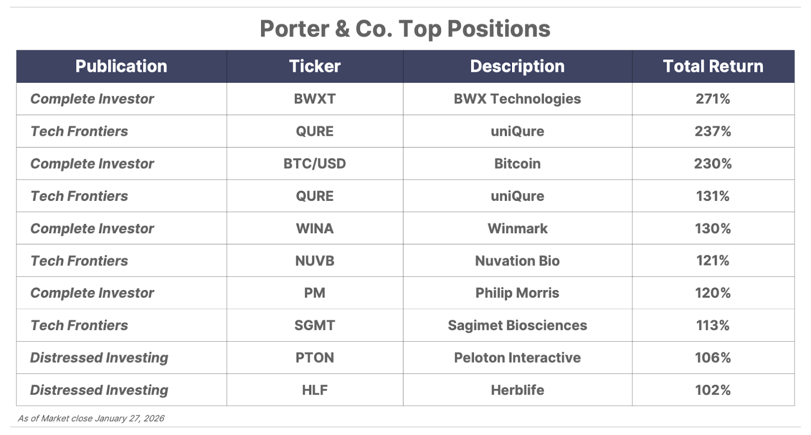 Please note: The investments in our “Porter & Co. Top Positions” should not be considered current recommendations. These positions are the best performers across our publications – and the securities listed may (or may not) be above the current buy-up-to price. To learn more, visit the current portfolio page of the relevant service, here. To gain access or to learn more about our current portfolios, call our Customer Care team at 888-610-8895 or internationally at +1 443-815-4447.