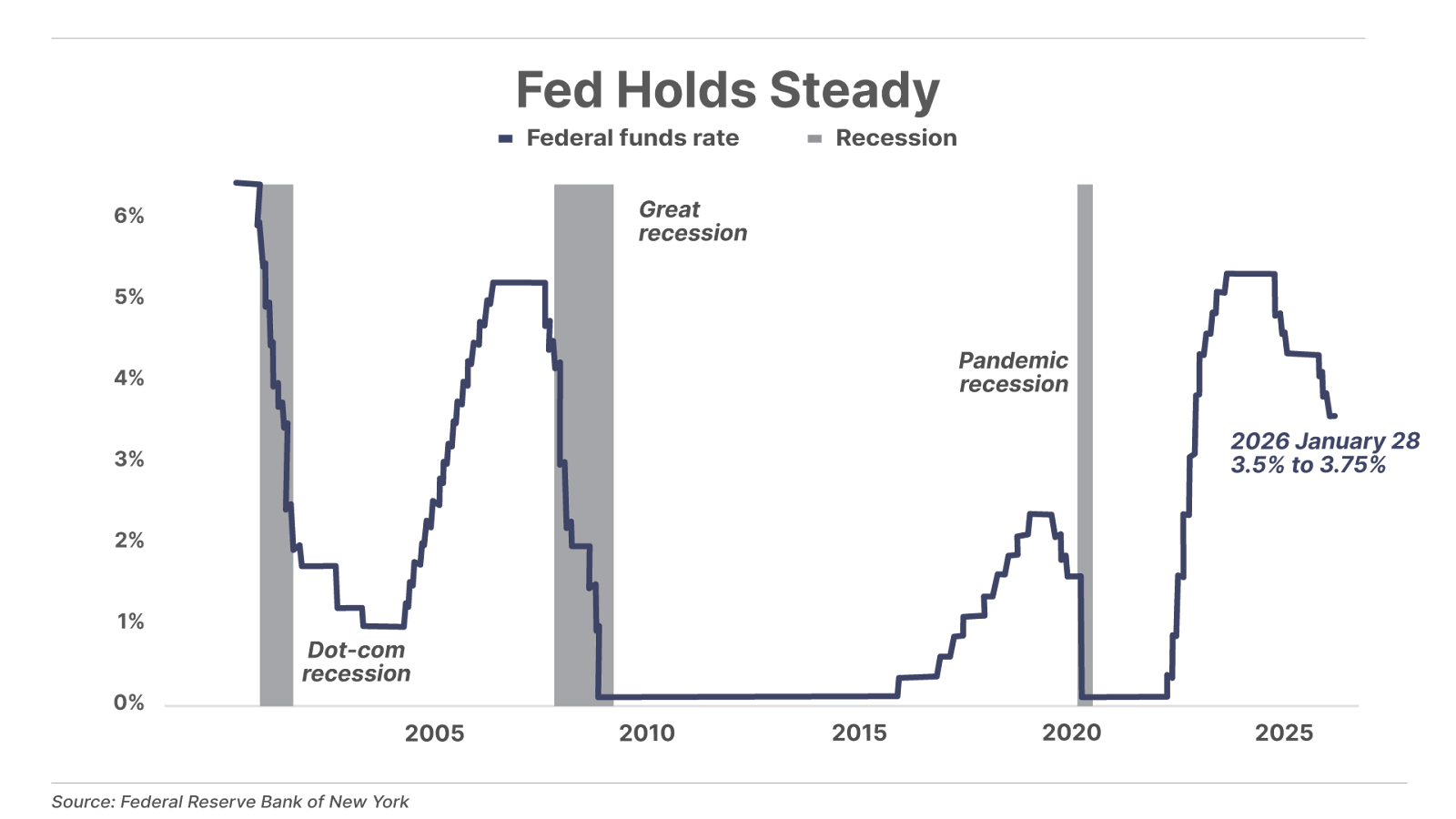 1. The Federal Reserve pauses after three consecutive rate cuts. This afternoon, the Federal Open Market Committee (“FOMC”) held rates unchanged in a range of 3.50% to 3.75% as expected. As has been the case in several recent meetings, there were dissents, with two Fed governors – Stephen Miran and Christopher Waller – both voting for another 25-basis-point cut. In his post-meeting press conference, Chair Jerome Powell explained the pause, indicating the FOMC believes the outlook for the labor market has improved since last month, while inflation remains “somewhat elevated.” Given this “balance of risks,” Powell said the Fed is not on a preset course and future rate decisions will be made on a meeting-by-meeting basis.