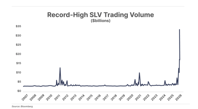 Yesterday, a record $32 billion worth of the iShares Silver Trust (SLV) shares changed hands – more volume than any other security on the planet, including the S&P 500 ETF (SPY) – and a classic indicator of a late-stage buying frenzy.