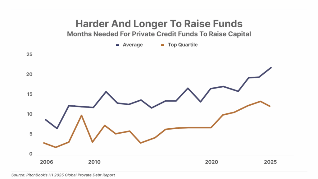 3. Private credit is running dry. Private credit funds, which Marty Fridson wrote about this summer, now take 23 months to raise money – almost double the pace of 2021. Pensions are tapped out, stuck in private-equity deals with no exits and no liquidity. The biggest credit funds are turning to private wealth as the new source of funding. Smaller funds are struggling even more, taking 25 months to raise capital – relying less on seasoned institutions and more on second-tier investors. As a result, the cracks are beginning to show – First Brands, a car appliance maker just filed for bankruptcy, and its debt now trades at 36 cents on the dollar, dragging private credit funds down with it.