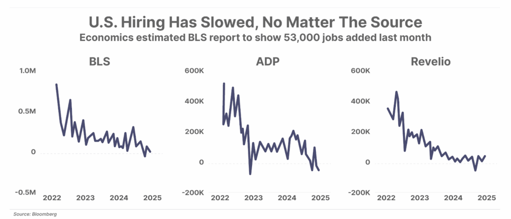 2. Alternative jobs data reveals a sluggish labor market. The federal government shutdown prevented the Bureau of Labor Statistics (“BLS”) from issuing the September payroll report this morning. However, alternative data sources point toward a weakening labor market. This includes America’s largest payroll processor, ADP, which reported a decline of 32,000 jobs last month. Likewise, jobs-posting website Indeed.com reported a 2.5% drop in job listings in September. Employment analytics firm Revelio reported an uptick of 60,000 jobs in September – a number that is still well below the 150,000 to 200,000 monthly hiring rate considered healthy for the U.S. labor market.
