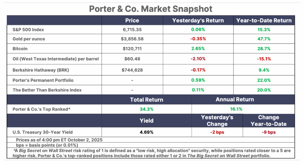 This is Porter’s Daily Journal, a free e-letter from Porter & Co. that provides unfiltered insights on markets, the economy, and life to help readers become better investors. It includes weekday editions and two weekend editions… and is free to all subscribers.