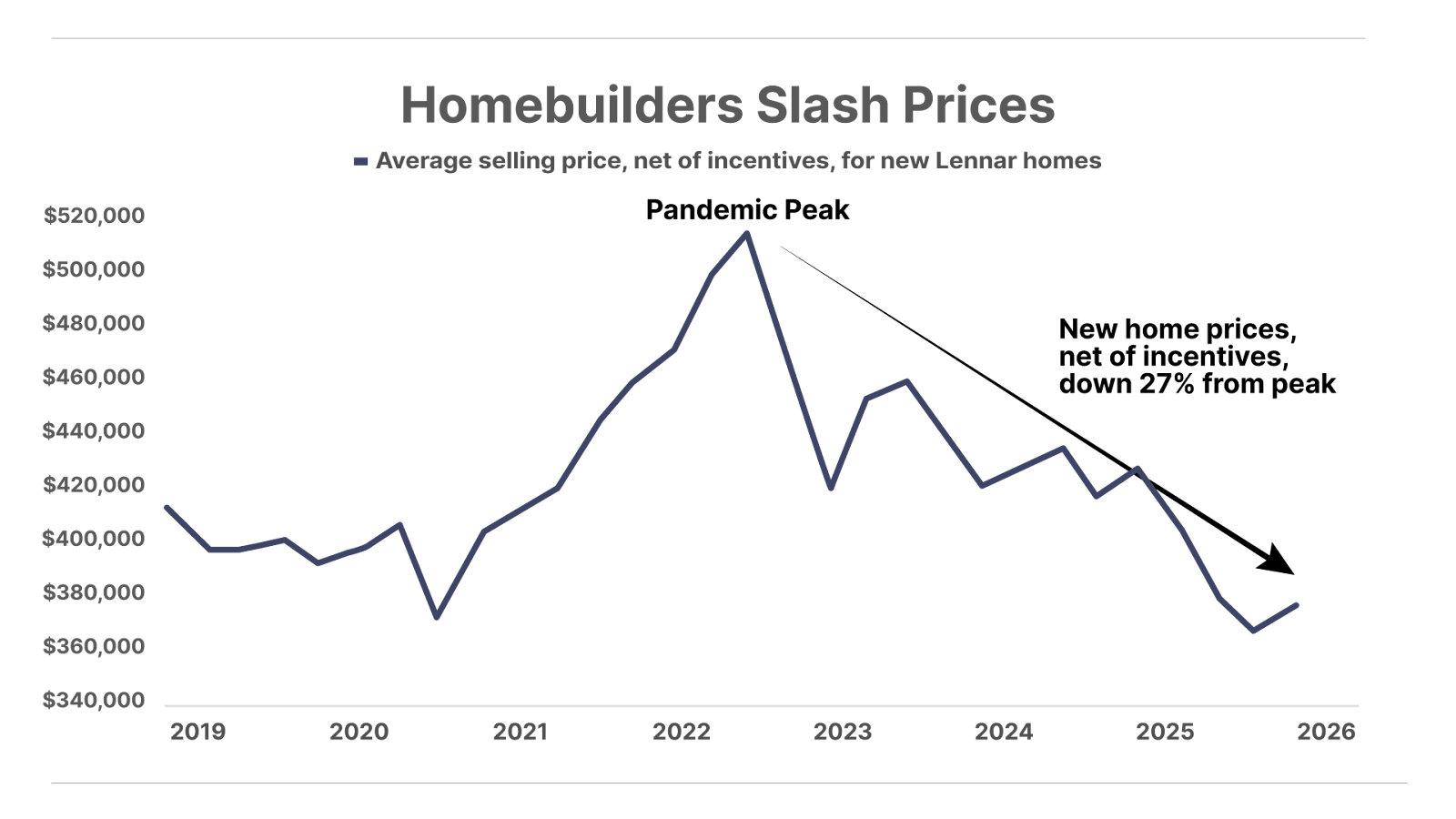 3. Homebuilders slash prices. While official data show U.S. home prices hovering near record highs, America’s homebuilders tell a different story. In response to weak demand, companies like Lennar (LEN) – America’s number-two homebuilder – are offering record amounts of incentives to move inventory. Factoring in these incentives as de facto price reductions, Lennar has cut prices 27% since the pandemic-era peak. Unlike existing homeowners who can take their properties off the market if they don’t get their price (which they’ve done in record numbers this year), builders are forced to move inventory. Thus, the effective prices reported by builders like Lennar provide a more real time view of actual prices buyers are willing to pay.