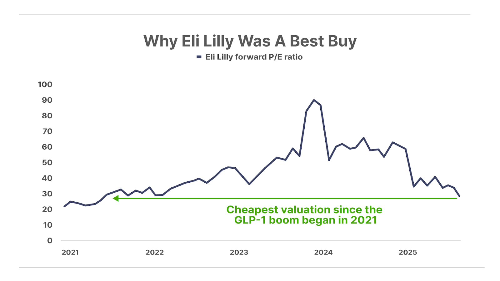 The sell-off in Lilly shares was overdone – and created a rare opportunity to buy Eli Lilly at just 25x next year’s earnings – a valuation not seen since before the GLP-1 boom began. That made it the cheapest entry point since mid 2021, when major competitor Novo Nordisk (NVO) won the first weight-loss approval for a GLP-1 drug, and well before Eli Lilly launched its own blockbuster competitor, Mounjaro, in mid 2022.