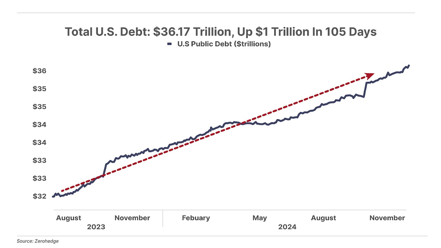 3. The U.S. is in a spiraling debt crisis. Total U.S. public debt has hit $36.17 trillion – up $1 trillion in only 105 days, and $13 trillion since 2020. At this pace, U.S. debt is on track to reach $40 trillion by February 2026. And it’s only growing worse, with total debt to GDP at record levels – 121% – up from roughly 60% in 2008. An incredible 28% of the government’s $5 trillion in annual revenue goes toward paying interest on this debt. We’ve said it before and we’ll say it again: this isn’t sustainable.