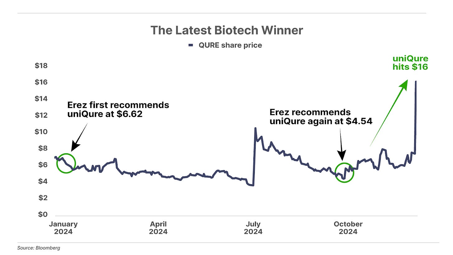 Biotech Frontiers stock uniQure (Nasdaq: QURE), which Erez Kalir recommended in October at $4.54 per share, bounced to $16 yesterday after announcing that the FDA had issued accelerated approval for uniQure’s breakthrough gene therapy for Huntington’s disease – a 250% gain in two months.