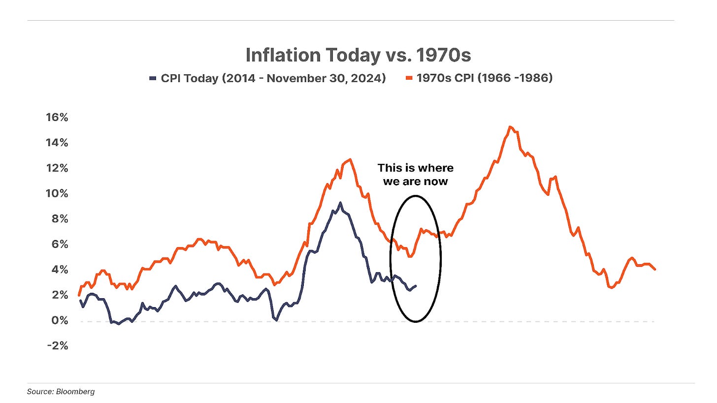 2. Inflation remains “sticky.” This morning, the Bureau of Labor Statistics reported consumer prices rose 2.7% year-over-year (0.3% month-over-month) in November, up from 2.6% (0.2%) in October. Core inflation – which excludes food and energy prices – remained at 3.3% year-over-year for the third consecutive month. However, while inflation remains well above the Federal Reserve’s official 2% target – and continues to look like a repeat of the “cut-too-soon” 1970s (see the graph below) – this month’s relatively modest increase is unlikely to dissuade the Fed from cutting rates by another 25 basis points when it meets next week.