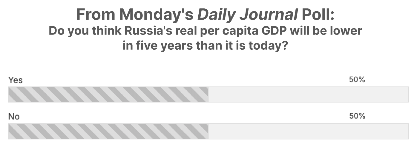 In the latest Black Label podcast, Porter sat down with polymath guest Jim Rickards to talk about the U.S. federal debt, the dangers of artificial intelligence, COVID… and much more… as well as the future of Russia. Porter and Jim disagreed about where Russia is going (as you’ll hear if you give the podcast a listen)... turns out that our Daily Journal readers do too: you’re split straight down the middle over whether Russia’s real per capita GDP is going up or down over the next five years.
