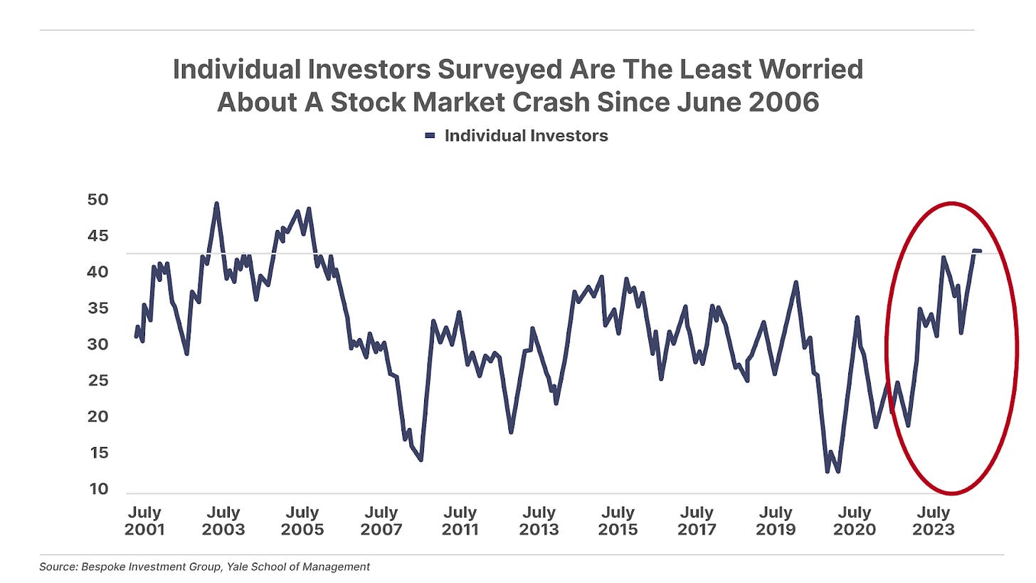 When no one is worried… be (very!) worried. 46% of mom-and-pop investors in the U.S. think there’s less than a 10% chance of a market crash over the next six months… the most optimistic outlook since June 2006. When way too many people agree on the same thing… you can be certain that they’re wrong, and that the exact opposite of what the sheeple think will happen. Don’t say we didn’t warn you…