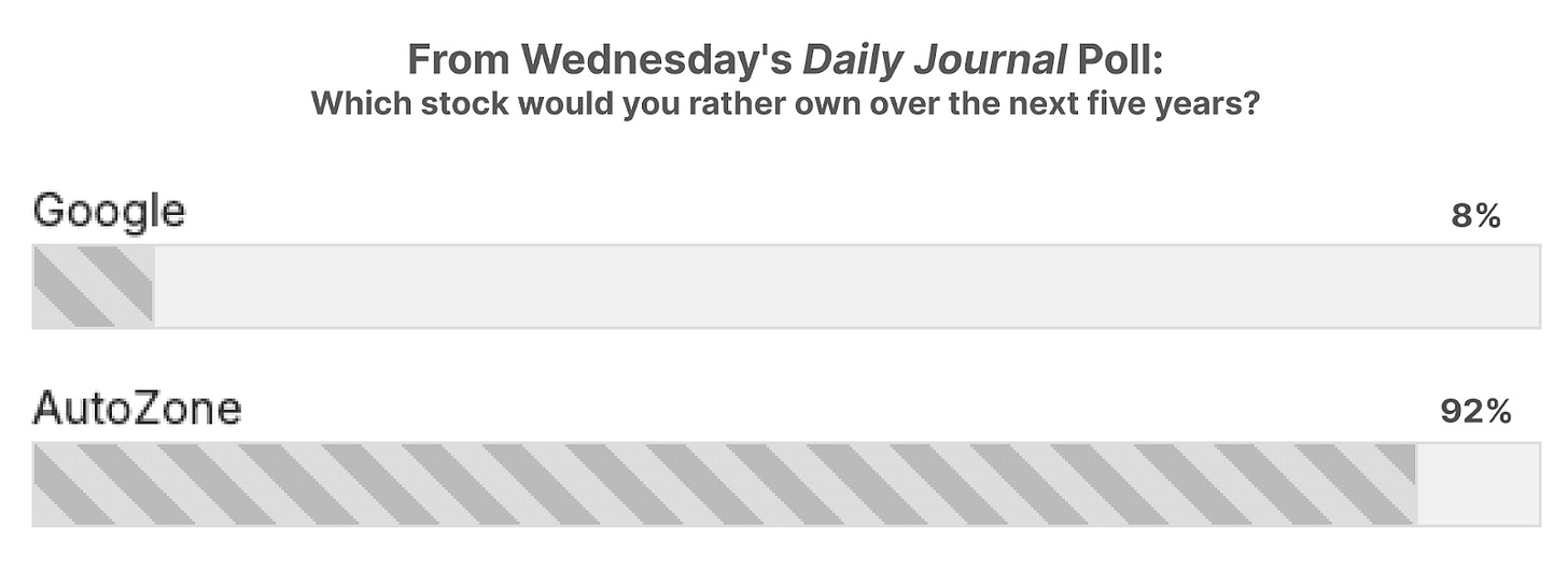 On Wednesday, Porter wrote about why he thinks shares of auto-parts distributor AutoZone ("the very definition of a boring business that shouldn’t be worth very much") are going to outperform those of tech giant Google – a company that on the surface is one of the greatest success stories in the history of capitalism, but due in part to accounting rules that don't reflect reality... isn't anything special. We asked Daily Journal readers, “Which stock would you rather own over the next five years”... Google or AutoZone?