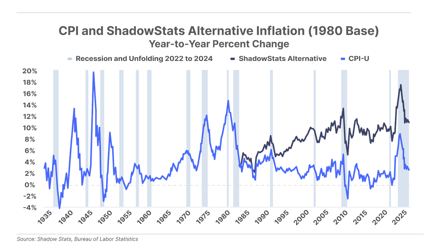3. Inflation expectations surge. The University of Michigan one-year inflation-expectation survey jumped from 3.3% last month to 4.3% in February – the highest inflation-expectation reading since November 2023. Meanwhile, the latest CPI report for December showed a 2.9% annual increase, an acceleration from November’s 2.7%. Since November, one-year inflation expectations rose from 2.6% to 4.3% – a 1.7 percentage point rise in just three months. Adding to concerns, the ShadowStats alternative CPI measure, which seeks to measure the inflation that Americans actually experience every day, shows it running at 10.6%. One thing is clear: inflation isn’t dead… and doesn’t even seem to be fading anytime soon.