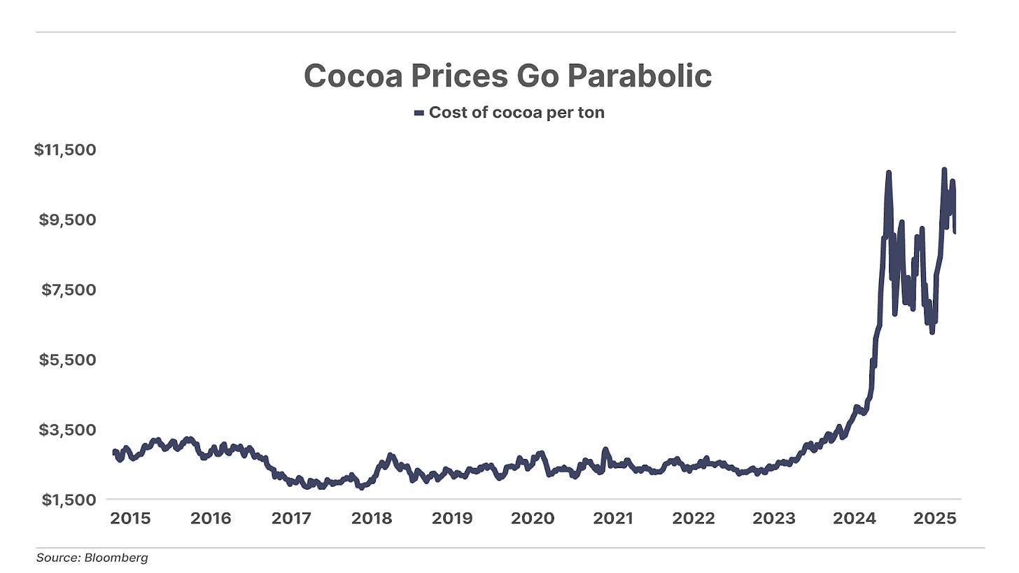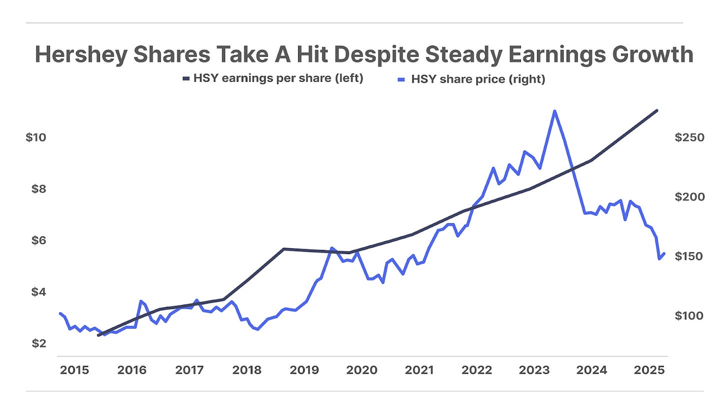 The other knock on Hershey has been that soaring cocoa prices would hurt margins and profits. Benchmark cocoa futures prices were up more than 300% this year, from less than $3,000 a ton to almost $12,000 a ton.