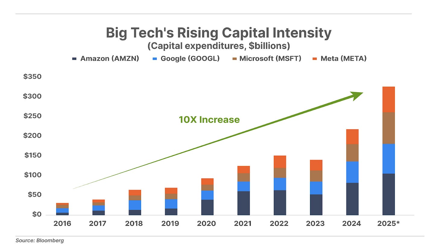 1. Big Tech’s spending spree accelerates. Fears that Chinese AI startup DeepSeek’s low-cost large language model will kill the investment appetite for data-center spending have been greatly exaggerated – with Big Tech just announcing record-high capex plans. Amazon (AMZN), Alphabet (GOOG), Microsoft (MSFT), and Meta (META) will spend a combined $325 billion this year (10x 2016 levels) on capital investments, most of which will go toward new AI data-center infrastructure. While this is great news for the data-center suppliers, like Nvidia (NVDA), it’s unclear how Big Tech’s AI spending spree will improve their own financial prospects.