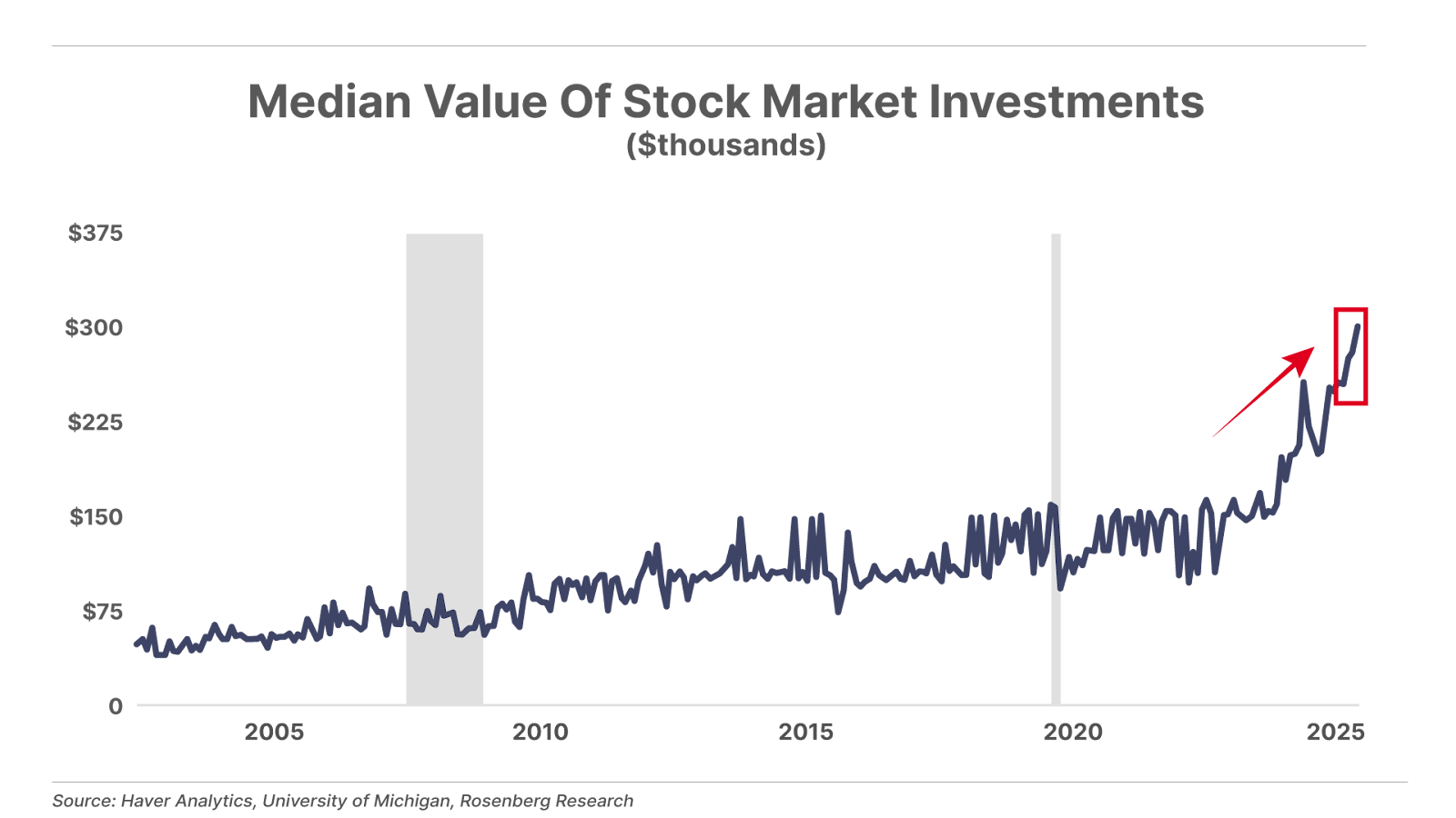 1. Americans have more exposure to stocks than ever before. According to the latest University of Michigan consumer survey, the median value of U.S. investors’ stock market holdings has surpassed $300,000 for the first time. This sum has more than tripled since April 2020 and is up 50% since March of this year. Equities now account for a record 52% of U.S. household wealth, roughly five percentage points above the prior record set during the 2000 dot-com bubble peak.